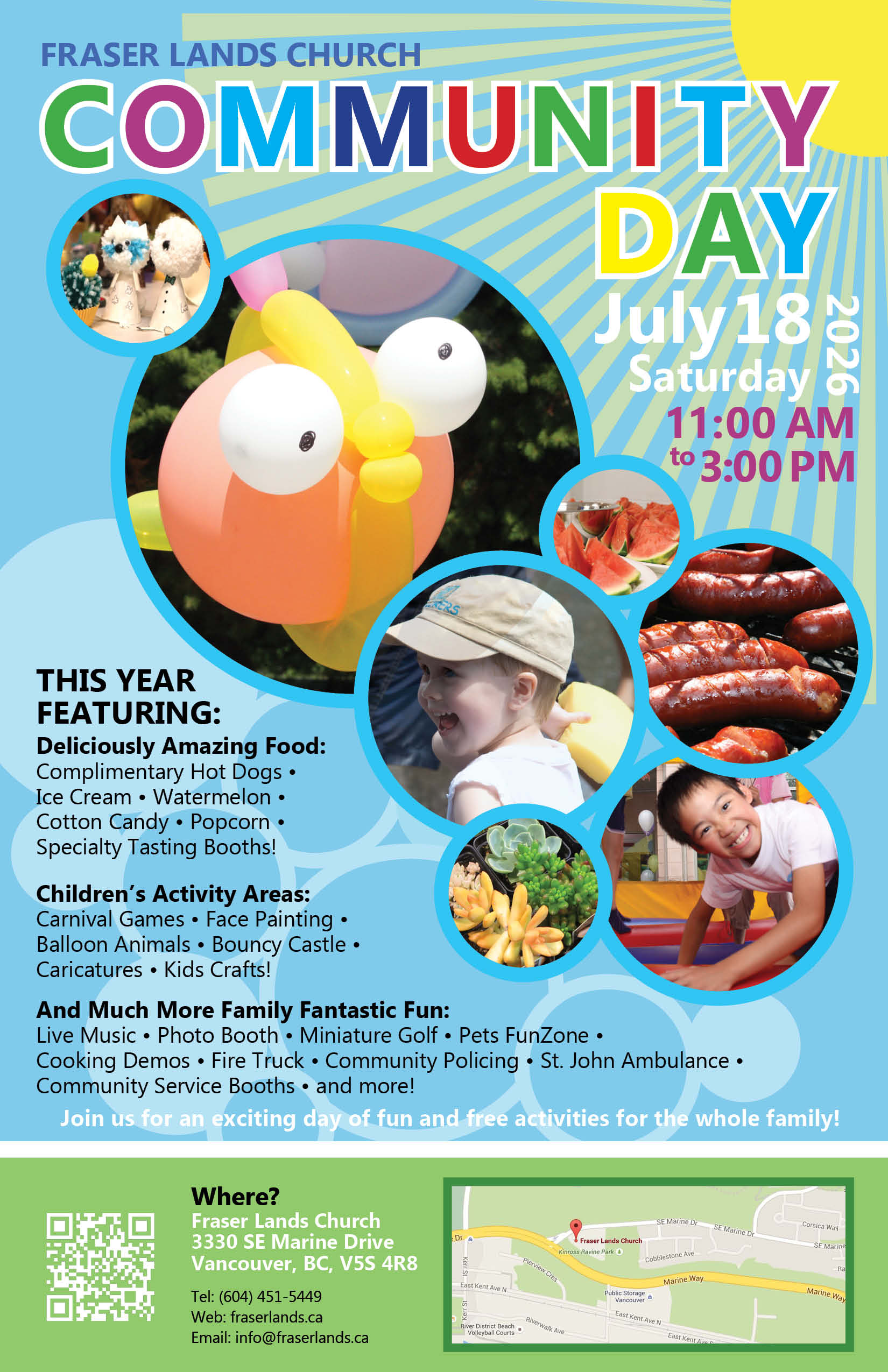 Fraser Lands Community Day is an annual free event for our local communities neighbouring our church. It’s an opportunity to have fun, food, meet your neighbours, and learn more about the various resources and organizations that are available in our community.